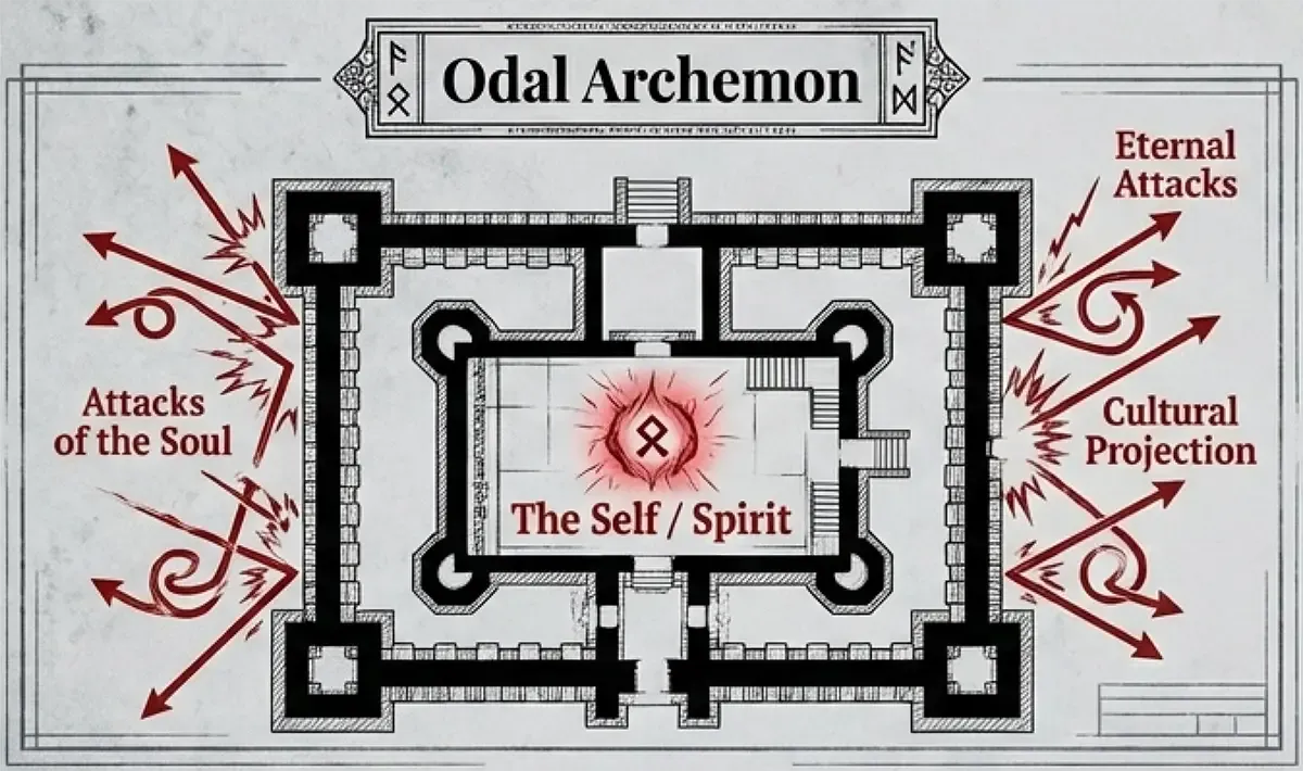 In this strategic context, the world is viewed as a battlefield or Valplads, where the enemy forces attempt to cut off the path of return to the Origin. The Odal Archemona provides a safe plaza where the warrior can rest and plan his next offensive move without the danger of being contaminated by the "isotropic time" of the macrocosm. This technique allows the physical body to be transmuted into a walled fortress, effectively "desynchronising" the individual from the collective archetypes that govern ordinary humanity. To hold this plaza, the initiate must exhibit a heart of ice and a will of fire, remaining relentless in his hostility toward the material world while he prepares for the final combat.